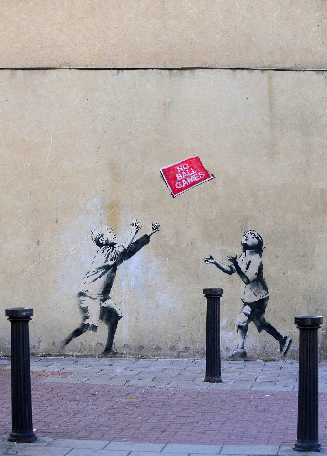 • el Museo Británico de Londres. En este último caso (en mayo de 2005), colgó una pintura rupestre de aspecto primitivo que mostraba una figura humana entre animales salvajes empujando un carro de supermercado.