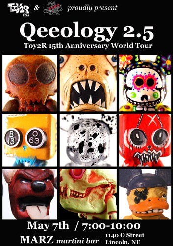 Además de los nuevos productos, Toy2r esta exhibiendo el trabajo de artistas en sus plataformas como parte de la celebración de su 15 aniversario. El viernes 07 de mayo, Toy2r EU. y Local Hero Diseño presentará Qeeology 2.5 , en MARZ martini bar in Lincoln, Nebraska. con más de 100 Qees de una lista internacional de artistas.