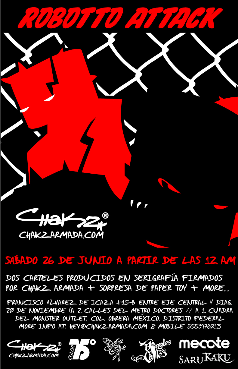 NUESTRO AMIGO CHAKZ IMPRIMIRA EL SIGUIENTE SABADO 26 DOS CARTELES PRODUCIDOS POR EL TALLER 75 GRADOS POR NUESTRO TAMBIEN AMIGO ARTURO NEGRETE, LOS CARTELES SERAN FIRMADOS POR CHAKZ ARMADA + SORPRESA DE PAPER TOY + MORE….