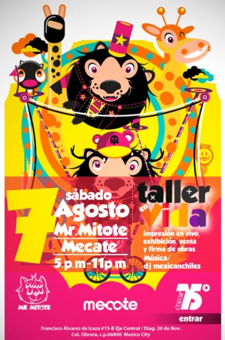 En la tercera fecha de el Taller en Vida se presentaran dos excelentes amigos Mr. Mitote y Mecate, ese día habra venta y firma de carteles. la cita es el sábado 7 de agosto a las 5 p.m. la musica correra a cargo de DJ Mexicanchiles, habra muchas sorpresas.